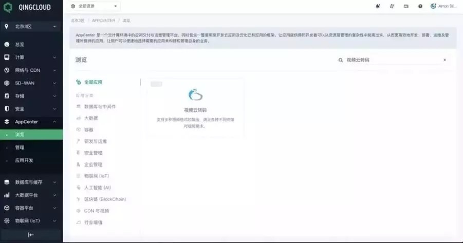 作為青云QingCloudAppCenter上的獨(dú)立應(yīng)用,用戶可以搜索“視頻云轉(zhuǎn)碼”關(guān)鍵詞快速找到應(yīng)用。
